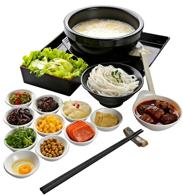 過(guò)橋米線是云南滇南地區(qū)特有的小吃,屬滇菜系,起源于蒙自地區(qū),由湯料、佐料、生的豬里脊肉片、雞脯肉片、烏魚(yú)片及五成熟的豬腰片、肚頭片、水發(fā)魷魚(yú)片制作而成。